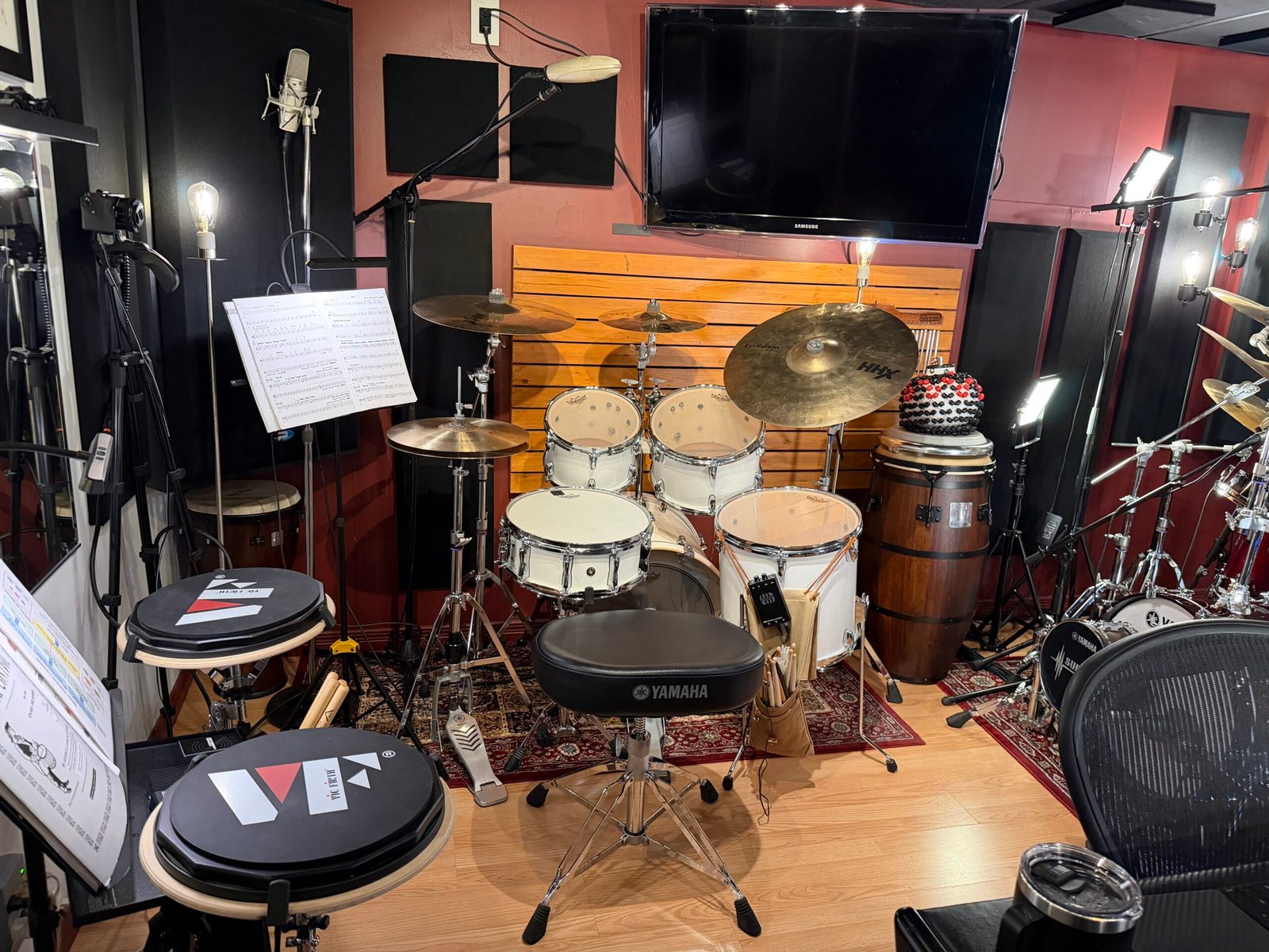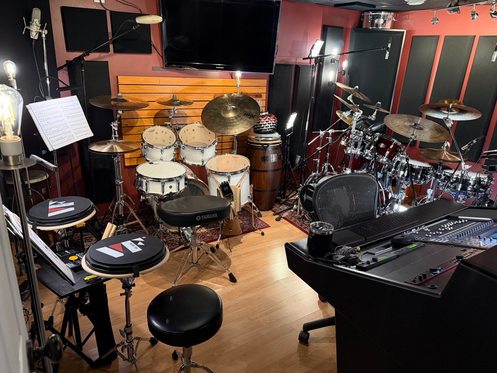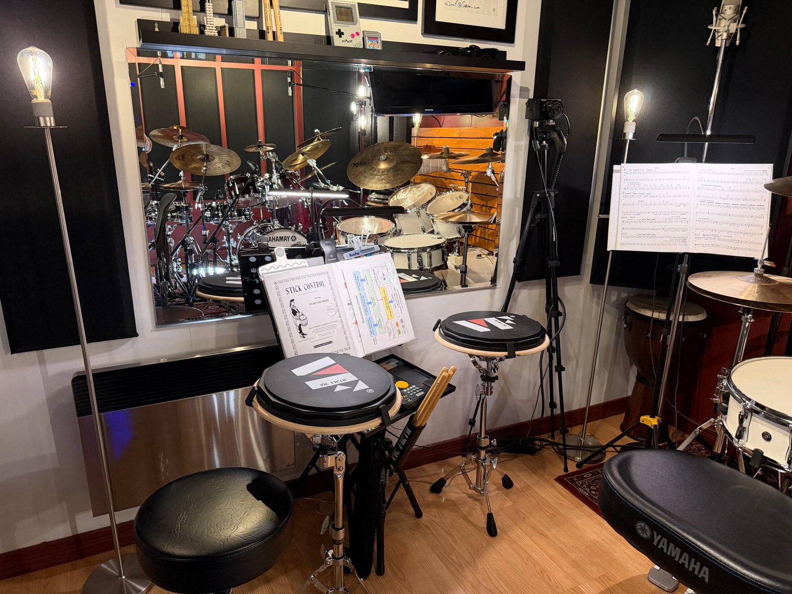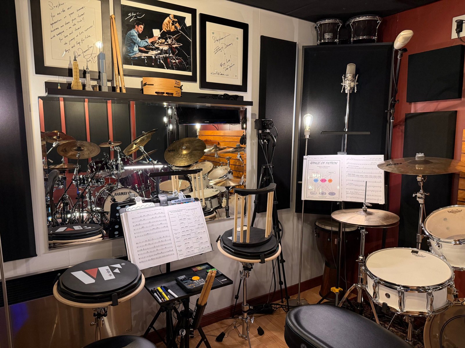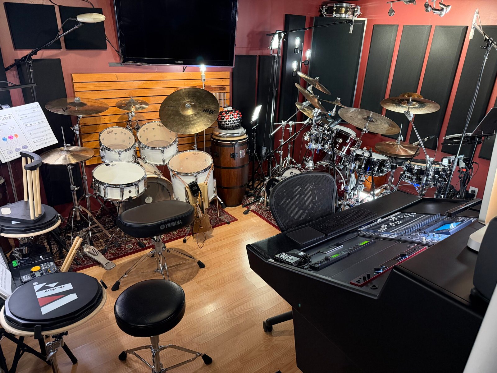 Des étudiants se rendent à Québec, au Canada, pour bénéficier de cours particuliers. Des sessions intensives sont proposées, offrant des plages horaires flexibles allant d'une à six heures par jour. Pour les cours en présentiel, le studio est entièrement équipé pour offrir une expérience d’apprentissage complète et immersive avec différentes sections. La section technique comprend un grand miroir pour l’analyse des mouvements, des Dom’s Pad Sticks ainsi qu’une vaste collection de baguettes spécialisées permettant de comprendre en profondeur la physique du geste. On y retrouve aussi un métronome, un ToneAlly, et tout le matériel nécessaire pour développer une technique solide et efficace. La section batterie dispose d’un instrument dédié à l’élève, d’un système in-ear, ainsi que d’un studio d’enregistrement permettant de capturer et analyser le jeu. Un écran géant est utilisé pour afficher les livres, vidéos et ressources en ligne, rendant chaque session interactive et moderne.Une section lecture est également aménagée pour travailler à partir de méthodes rudimentales ou classiques. Il y a aussi une bibliothèque qui comporte plus de 200 méthodes de batterie. Ces ressources permettent à Stéphane de concevoir des programmes personnalisés adaptés aux besoins et aux objectifs de chaque élève. Les cours peuvent être enregistrés pour permettre un suivi et une révision du contenu travaillé. Le studio offre une ambiance décontractée et professionnelle, dans un environnement insonorisé et acoustiquement traité, propice à la concentration et au plaisir d’apprendre — une véritable bulle musicale où tout est pensé pour le développement optimal du musicien.